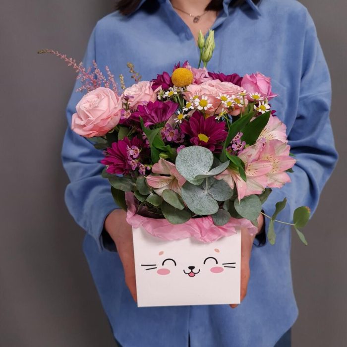 Альстромерия – 1 шт.Астильба – 3 шт.Ваксфлауэр – 1 шт.Краспедия – 1 шт.Хризантема кустовая – 1 шт.Эвкалипт – 2 шт.Эустома – 1 шт.Ромашка кустовая – 1 шт.Коробка – 1 шт.губка флористическая с водой – 1 шт.