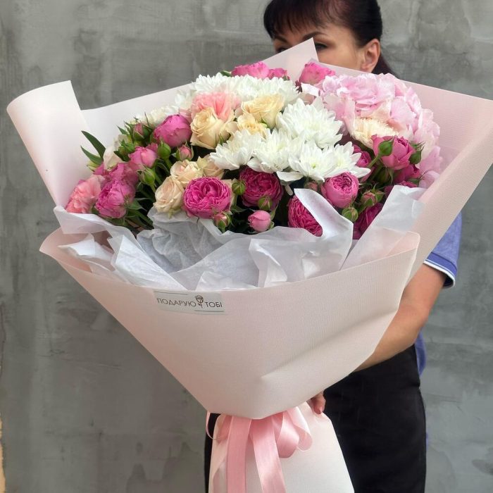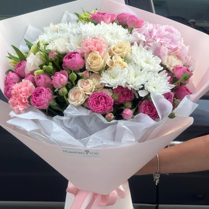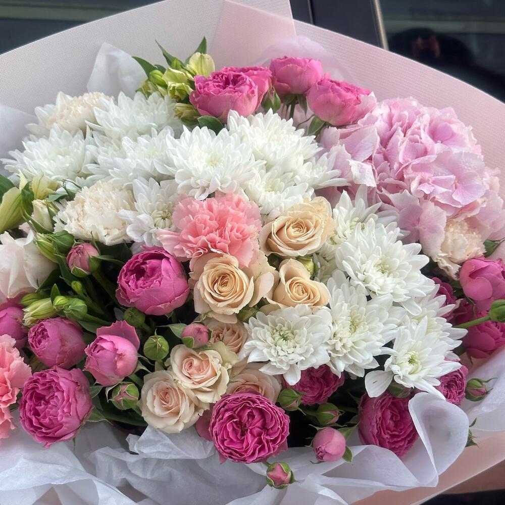 Альстромерии, Гвоздики, Кустовые розы, Лизиантусы, Розы, Хризантемы