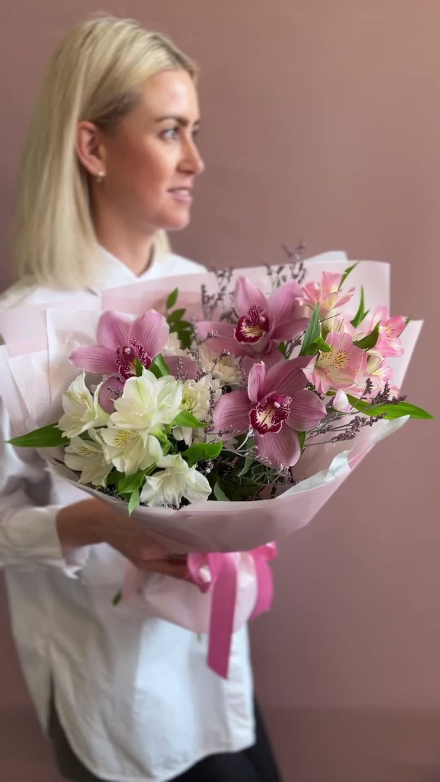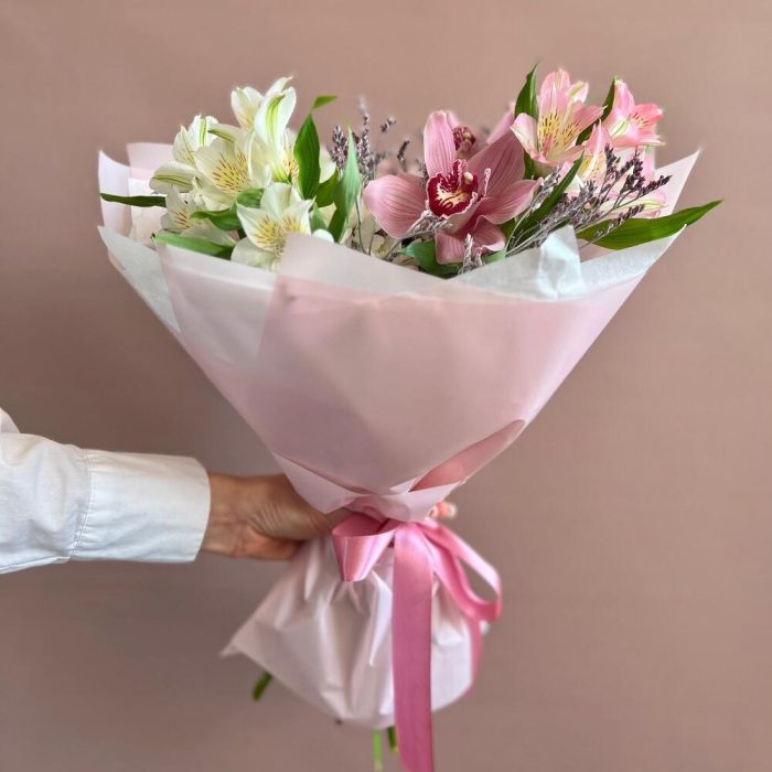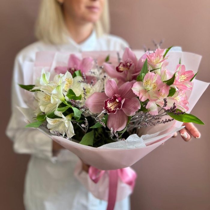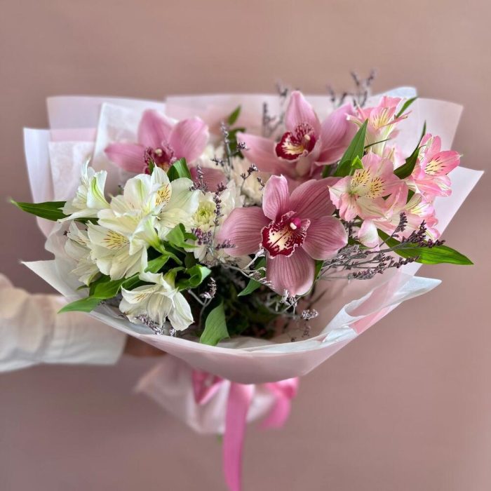 Нежный романтичный букет в розовой гамме. В составе орхидея цимбидиум, альстромерия, кустовая хризантема и лимониум. Идеальный букет на 8 мартаРекомендации по уходу: ежедневная смена воды с обновлением среза секатором или острым ножом. Цветы нужно ставить в прохладном месте, подальше от прямых солнечных лучей и отопительных приборов. Для того, чтобы букет дольше радовал получателя, мы отправляем с каждым заказом инструкцию по уходу и специальное средство для продления жизни цветов
