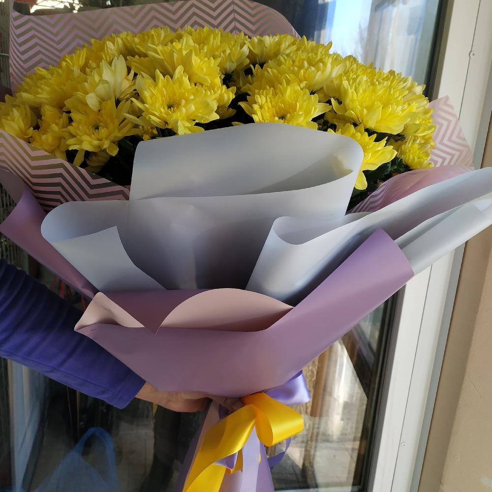 Хризантема кустовая – 15 шт.Упаковка дизайнерская – 3 шт.Лента атласная – 2 шт.