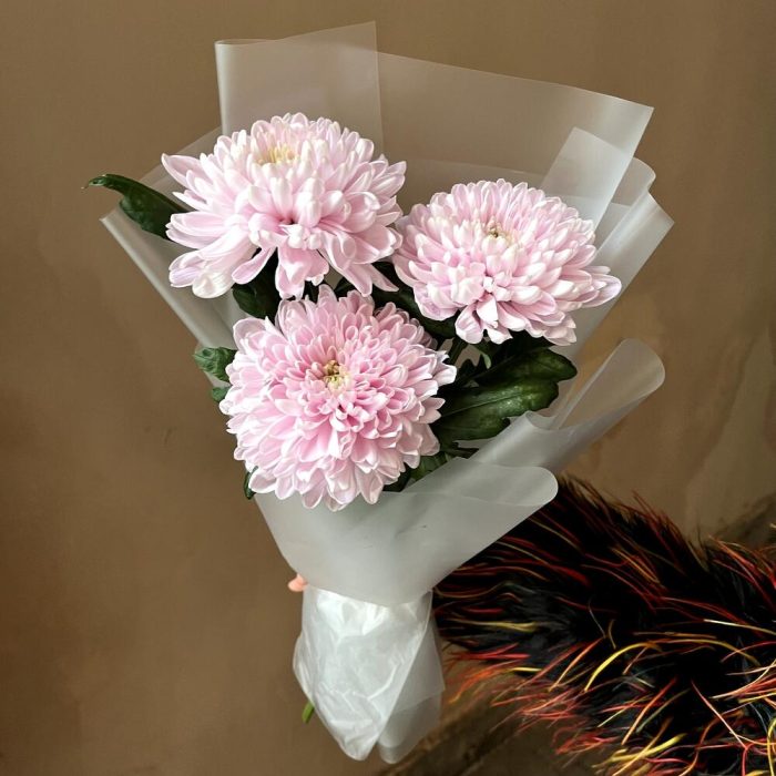 В сиреневую даль: 3 стойких хризантем в стильной упаковке