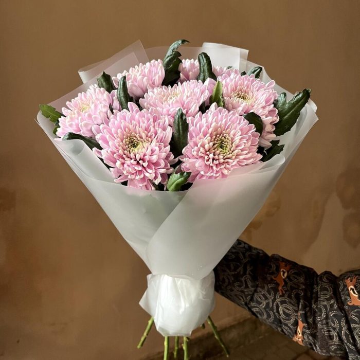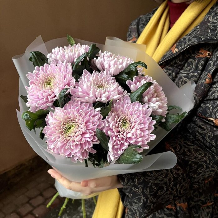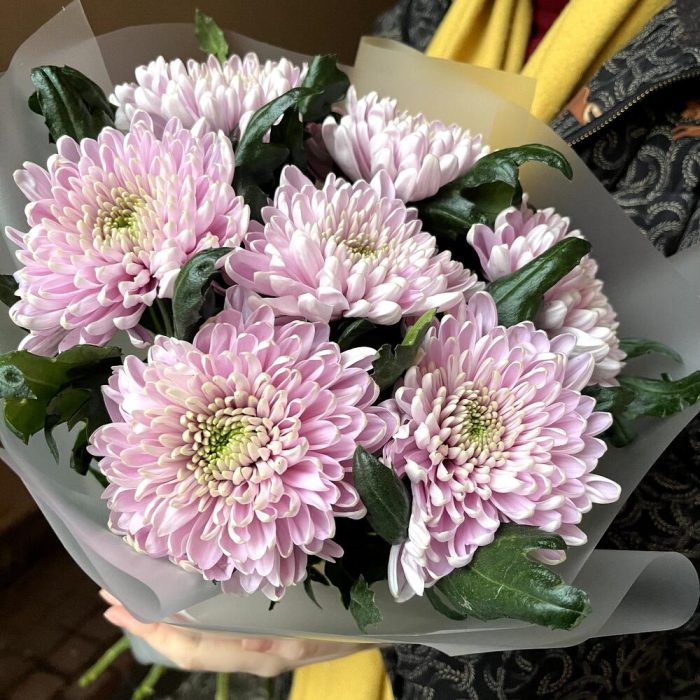 В сиреневую даль: стойкие хризантемы в стильной упаковке