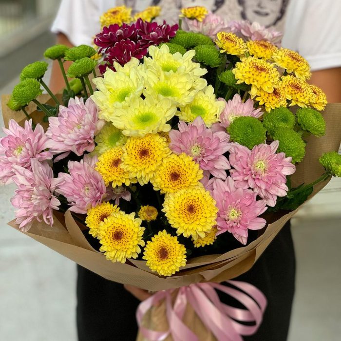 Хризантема кустовая желтая – 3 шт. Хризантема кустовая розовая – 3 шт. Хризантема зеленая кустовая – 3 шт. Хризантема кустовая бордовая – 1 шт. Хризантема кустовая лимонная – 1 шт.