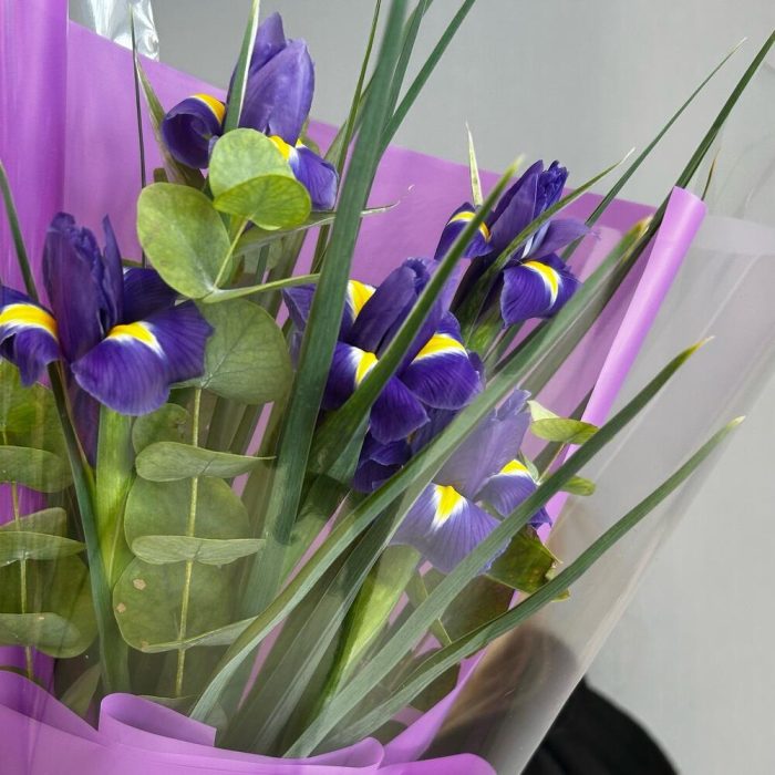Букет из ярких ирисов и ароматного эвкалипта