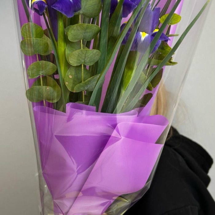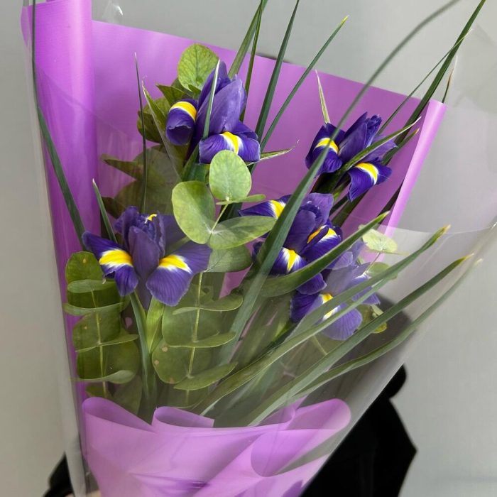 Ирис – 5 шт.Эвкалипт – 1 шт.Лента атласная – 1 шт.Упаковка дизайнерская – 2 шт.