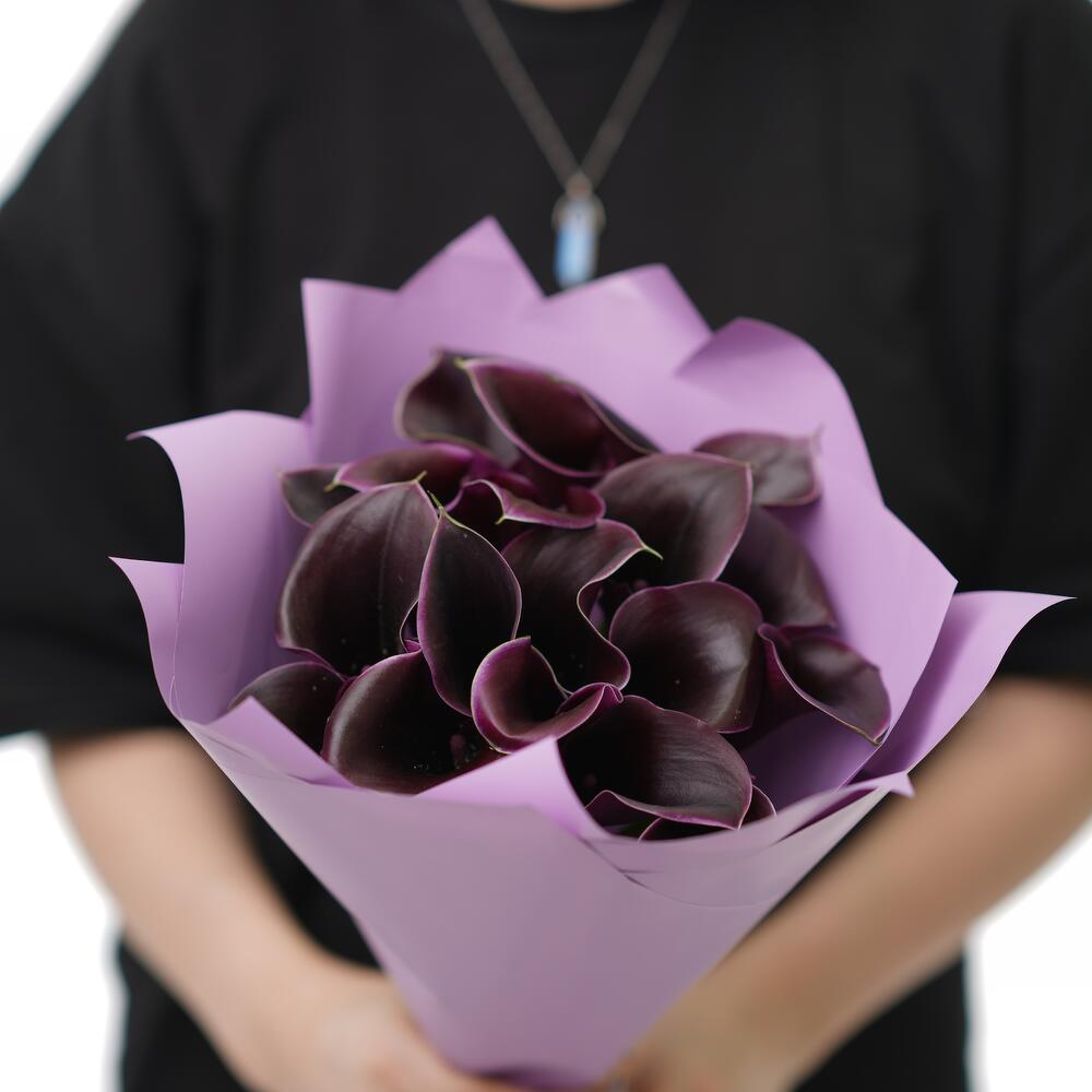черные каллы – 19 шт.Упаковка дизайнерская – 1 шт.Лента атласная – 2 шт.открыточка – 1 шт.хорошее настроение – 100 шт.инструкция по уходу за цветами – 1 шт.коробка переноска – 1 шт.Кризал – 1 шт.