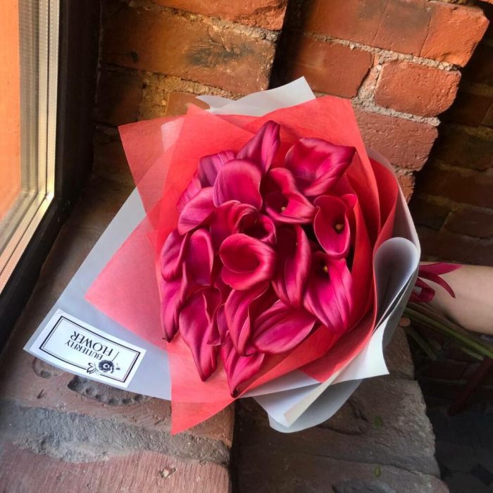Букет из 21 бордовой каллы в стильной упаковке “Минна”