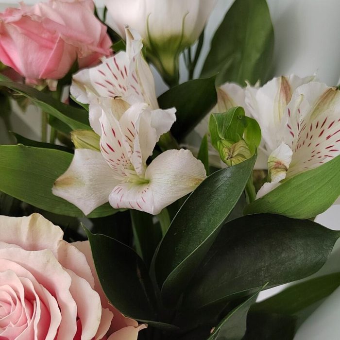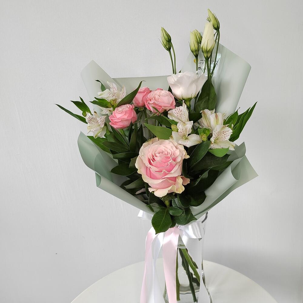 Альстромерия – 2 шт.Лента – 2 шт.Роза кустовая – 1 шт.Рускус – 3 шт.Роза – 1 шт.Упаковка – 1 шт.Эустома – 1 шт.