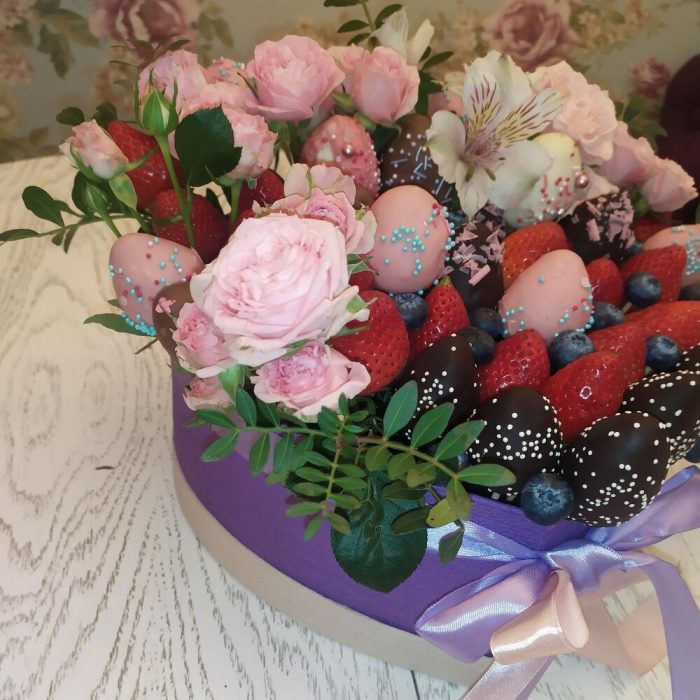 Альстромерия – 2 шт.Клубника – 20 шт.Роза кустовая – 3 шт.Коробка сердце – 1 шт.Голубика – 100 гр.Фисташка пучок – 5 шт.Клубника в шоколаде – 20 шт.Дизайнерская упаковка – 1 шт.