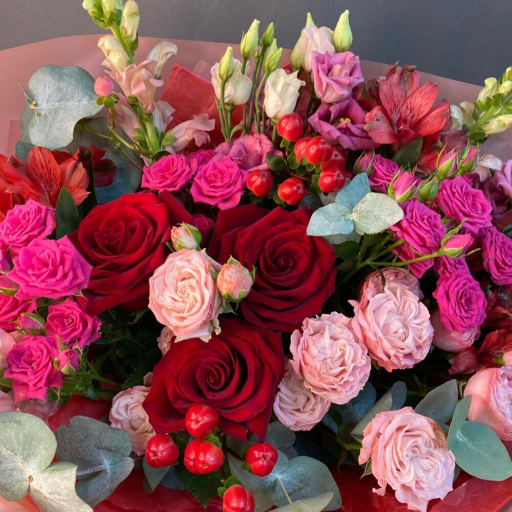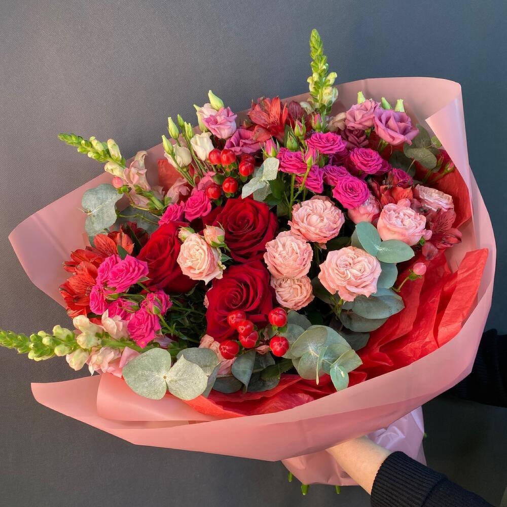 Гиперикум – 3 шт.Лизиантус – 3 шт.Роза кустовая Бомбастик – 2 шт.Эвкалипт – 2 шт.Лента атласная – 1 шт.Роза Эксплорер – 3 шт.Упаковка дизайнерская – 2 шт.Альстромерия Микс Европа – 3 шт.антиринум – 3 шт.роза кустовая пинк йо йо – 4 шт.