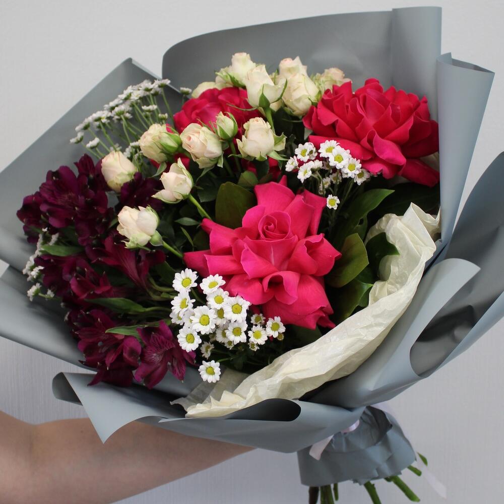 Альстромерия – 2 шт.Рускус – 1 шт.Сантини – 3 шт.Упаковка дизайнерская – 4 шт.Роза французская – 3 шт.Роза кустовая – 2 шт.