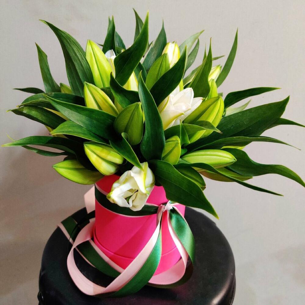 Оазис флористический – 1 шт.Лилия крупная белая – 9 шт.шляпная коробка в ассортименте – 1 шт.