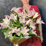Лента атласная – 1 шт.Лилия розовая – 7 шт.Упаковка дизайнерская – 1 шт.