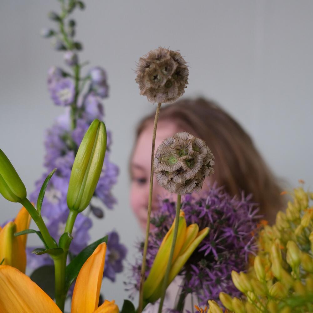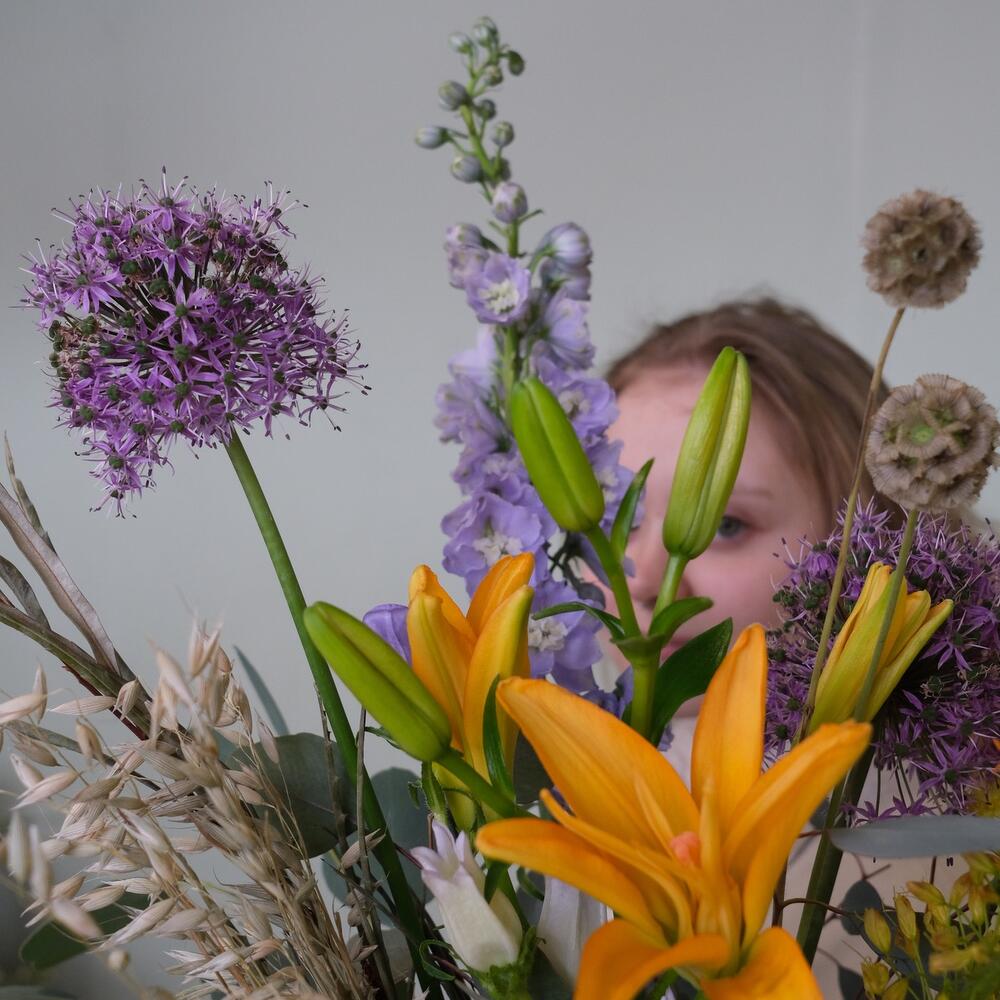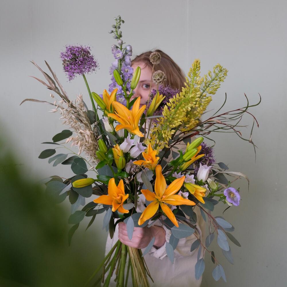 Лилия – 3 шт.Дельфиниум – 1 шт.эремурус – 2 шт.Колокольчик – 2 шт.Аллиум – 3 шт.Скабиоза – 2 шт.гривелия – 2 шт.овес пучок – 1 шт.Эвкалипт – 3 шт.