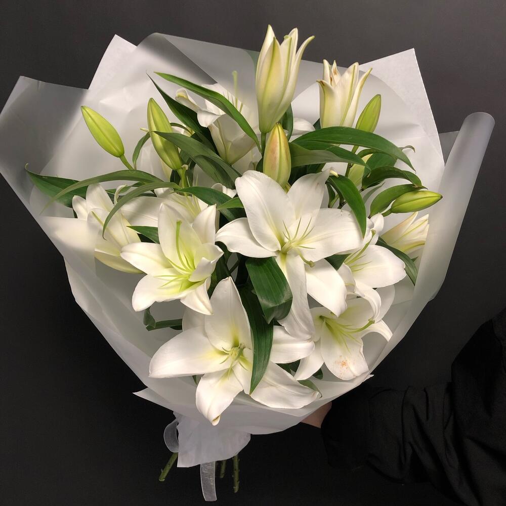 Лента атласная – 2 шт.Пленка матовая – 3 шт.Белый крафт – 2 шт.лилия белая премиум – 3 шт.