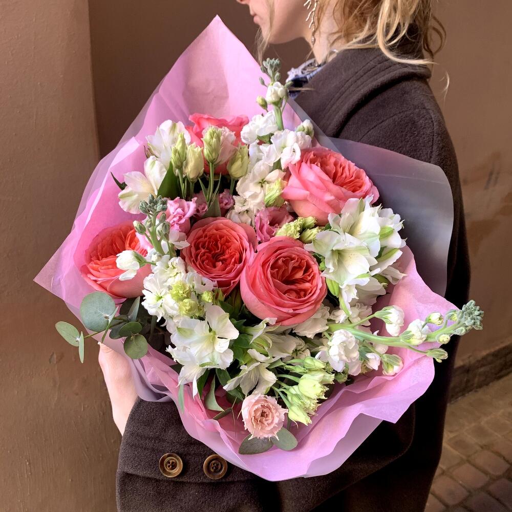 Альстромерия – 3 шт.Маттиола – 3 шт.Эвкалипт – 2 шт.Рускус сочи – 2 шт.Лизиантус розовый – 2 шт.Авторская упаковка – 1 шт.роза пинк экспрешн – 5 шт.