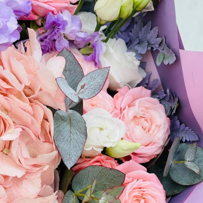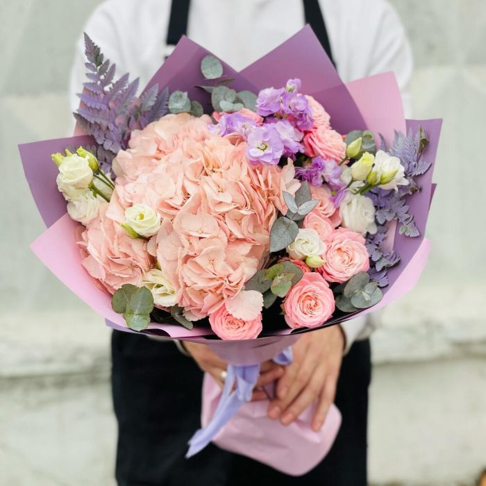 Гортензия – 1 шт.Маттиола – 1 шт.Папоротник – 2 шт.Эвкалипт – 5 шт.Эустома – 2 шт.Лента атласная – 1 шт.Упаковка дизайнерская – 5 шт.Бомбастик – 3 шт.