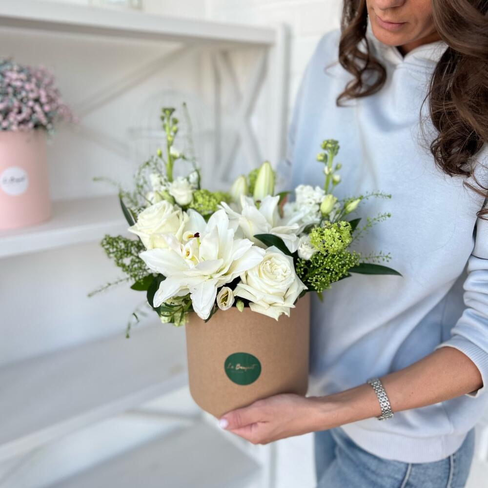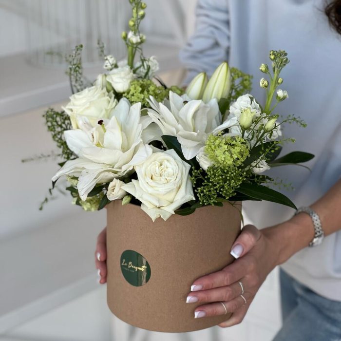 Белоснежная композиция с лилиями и розами