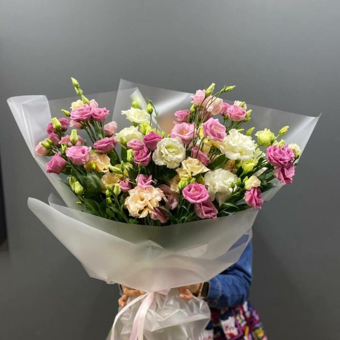 Букет из 15 белых и розовых эустом (лизиантусов) в стильной упаковке “Эландиэль”