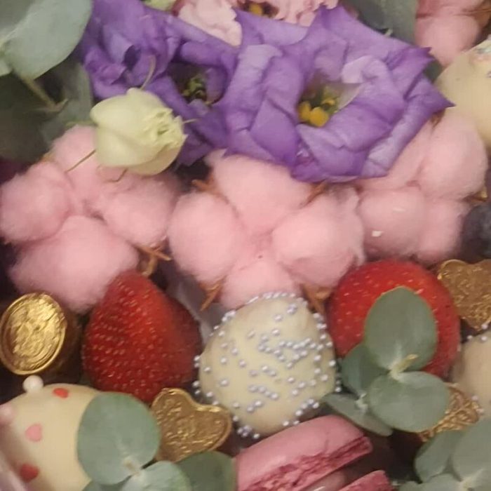 Клубника – 13 шт.Голубика – 10 шт.Лизиантус сиреневый – 4 шт.Хлопок натуральный – 7 шт.Лизиантус алиса пинк – 3 шт.макарон (пирожное) – 4 шт.Зефир клубничный – 6 шт.Клубника в шоколаде callebaut (бельгия) – 14 шт.зелень декоративная – 4 шт.конфеты кокосовые – 12 шт.транспортировочная упаковка – 1 шт.Упаковка дизайнерская – 1 шт.конфеты золотые – 16 шт.