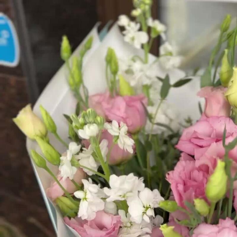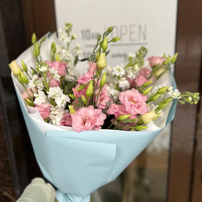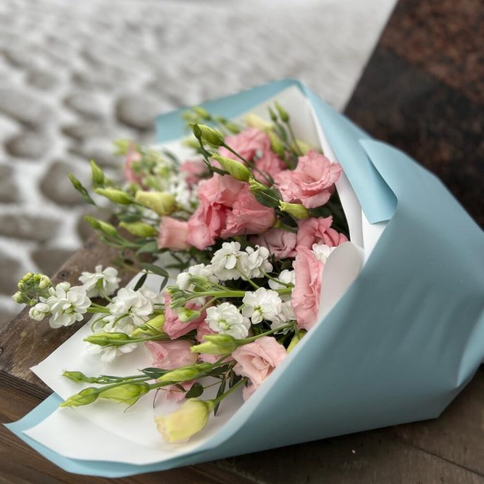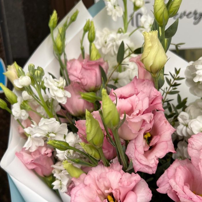 Маттиола белая – 5 шт.Упаковка дизайнерская – 4 шт.Лента атласная – 1 шт.Лизиантус – 5 шт.Эвкалипт Парвифолио – 1 шт.