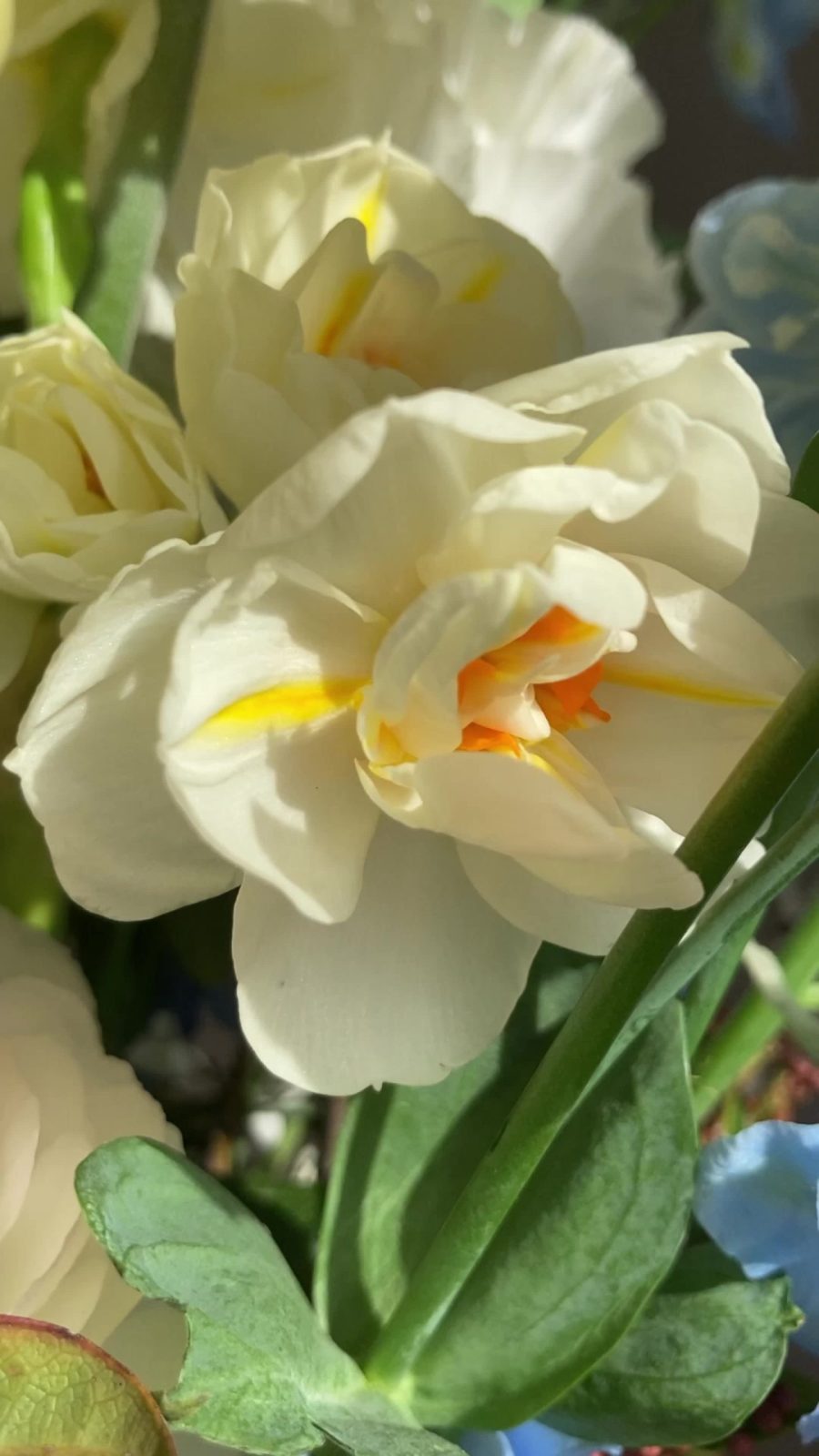 Букет с нарциссами, дельфиниумом и кудрявой герберой