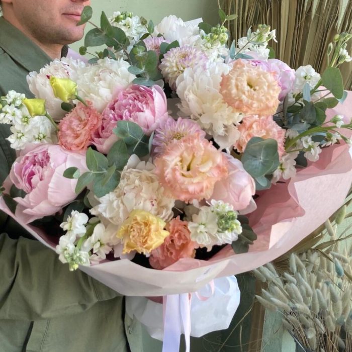 Пион – 9 шт.Маттиола – 11 шт.Лизиантус – 5 шт.Георгина – 3 шт.Эвкалипт – 11 шт.Упаковка – 1 шт.