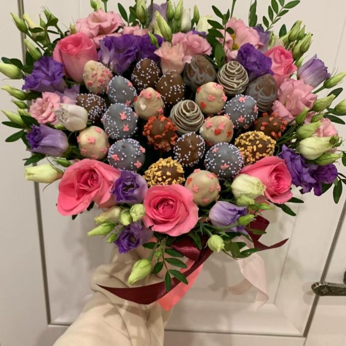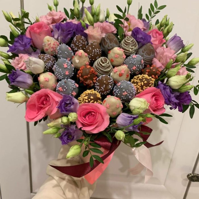 Лизиантус – 5 шт.клубника в бельгийском шоколаде – 23 шт.транспортировочная пленка – 1 шт.розы розовые – 5 шт.коробка сердцк – 1 шт.