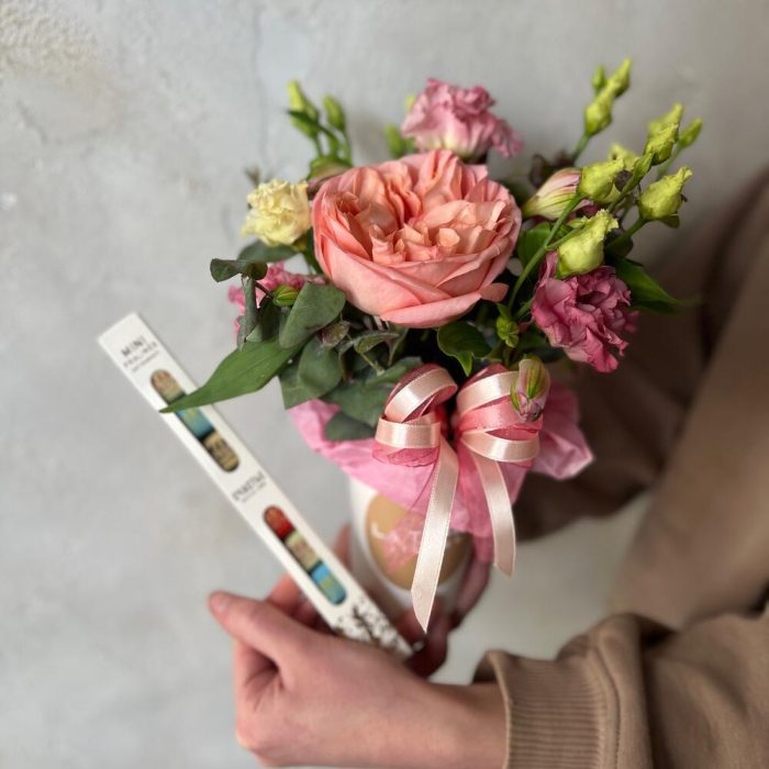 Альстромерия – 1 шт.Лизиантус – 1 шт.Эвкалипт – 1 шт.пинк экспрешн – 1 шт.стакан крафт – 1 шт.набор шоколада «счастье» – 1 шт.