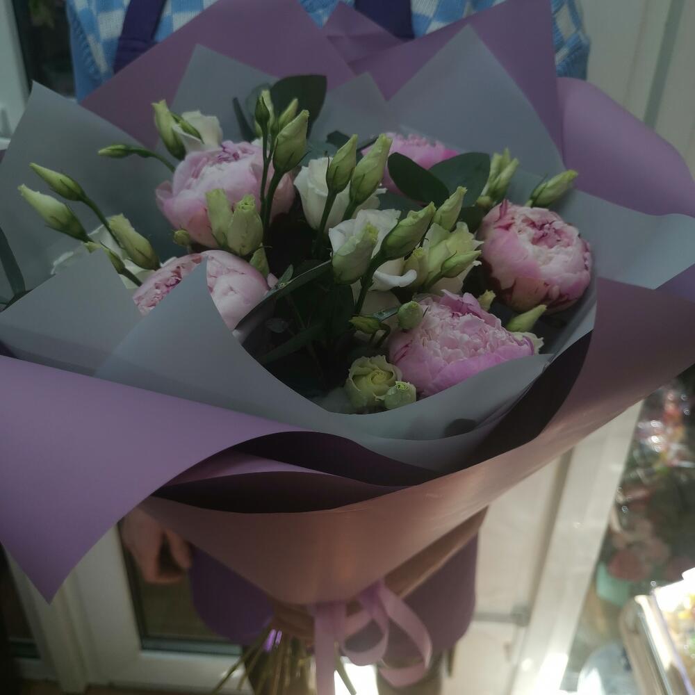 Эвкалипт – 3 шт.Лента атласная – 1 шт.Пион Сара Бернар – 5 шт.Упаковка дизайнерская – 2 шт.эустома белая – 2 шт.