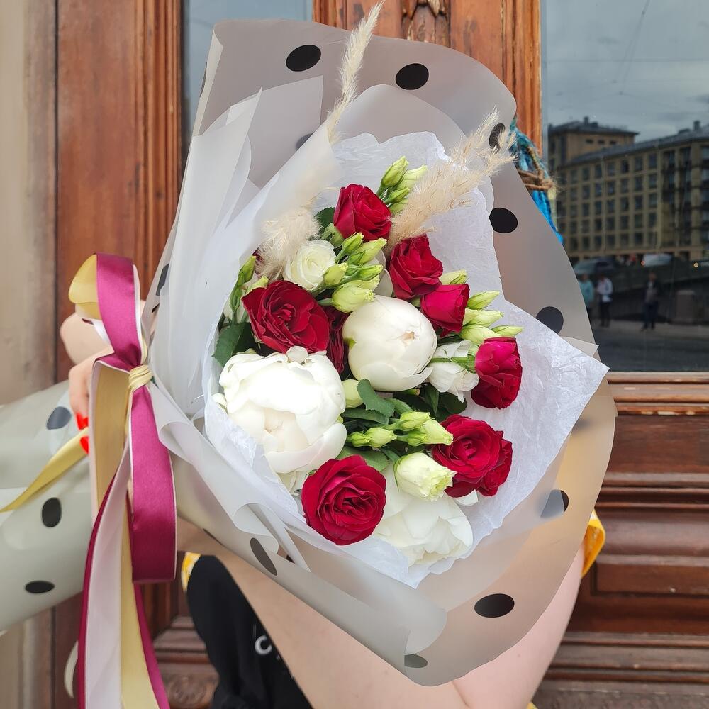 Комплимент из белых пионов и кустовой розы❣️