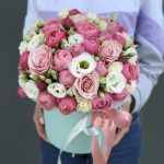 Сильвия – 12 шт. эустома белая – 5 шт. пинк мондиаль – 8 шт. Коробка шляпная – 1 шт. Оазис – 1 шт. Оформление лента – 1 шт.