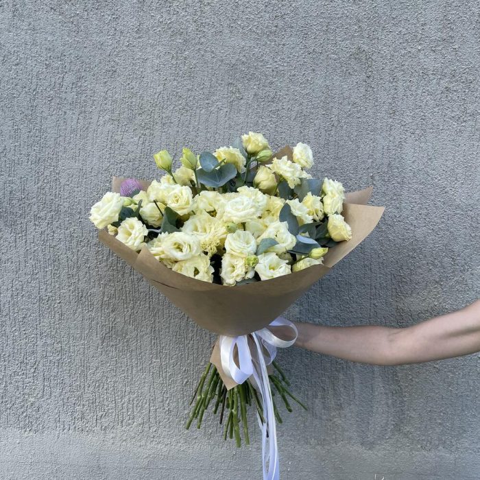 Монобукет из эустомы – это нежный и воздушный букет, созданный специально для того, чтобы подчеркнуть красоту и изящество этого прекрасного цветка. В букете используется эустома и немного эвкалипта, что придает ему особую элегантность и очарование.