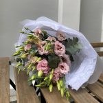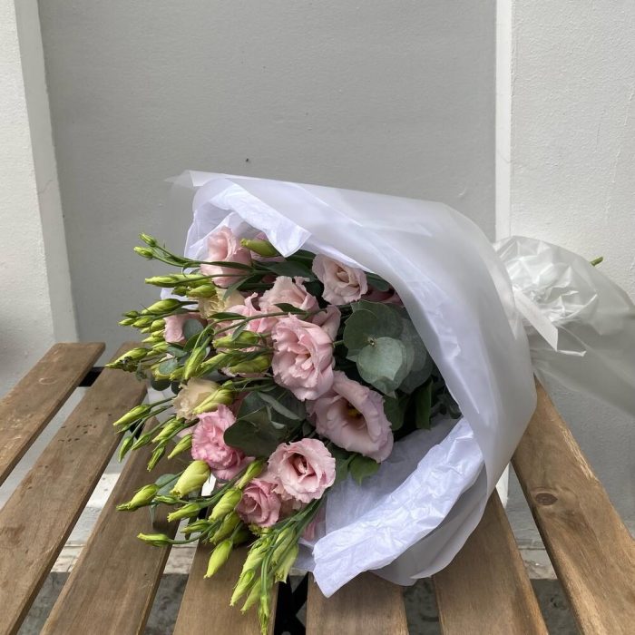 Лизиантус махровый розовый – 7 шт.Эвкалипт – 2 шт.Тишью – 2 шт.Упаковка дизайнерская – 4 шт.лента атласная брендированная красная – 1 шт.