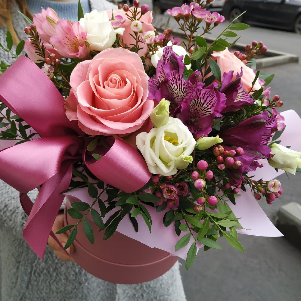 Роза Эквадор – 3 шт.Альстромерия – 2 шт.Ваксфлауэр – 2 шт.Лизиантус – 3 шт.Шляпная коробка – 1 шт.Фисташка – 1 шт.Лента атласная – 1 шт.Корейская пленка – 1 шт.Оазис – 1 шт.