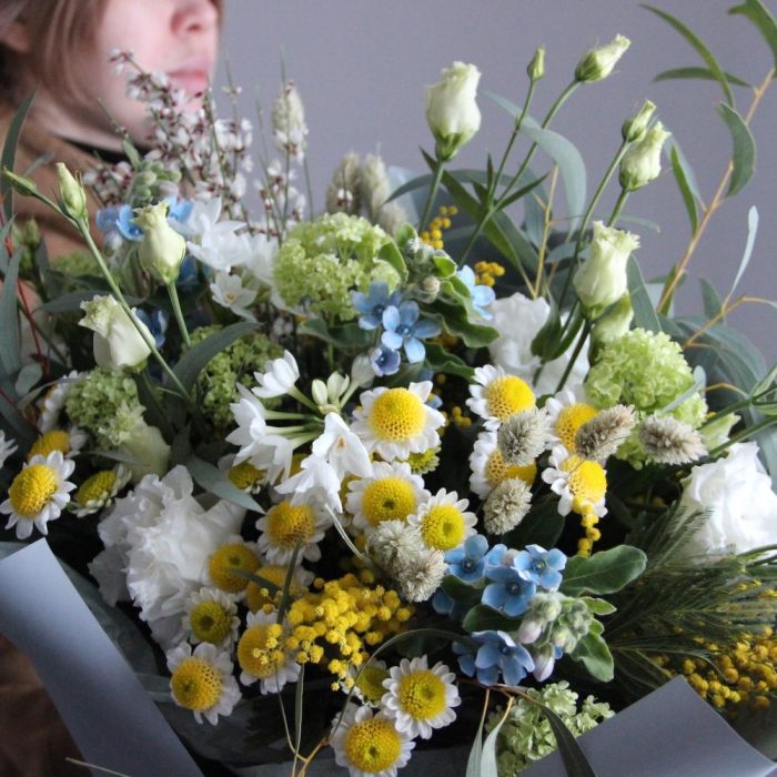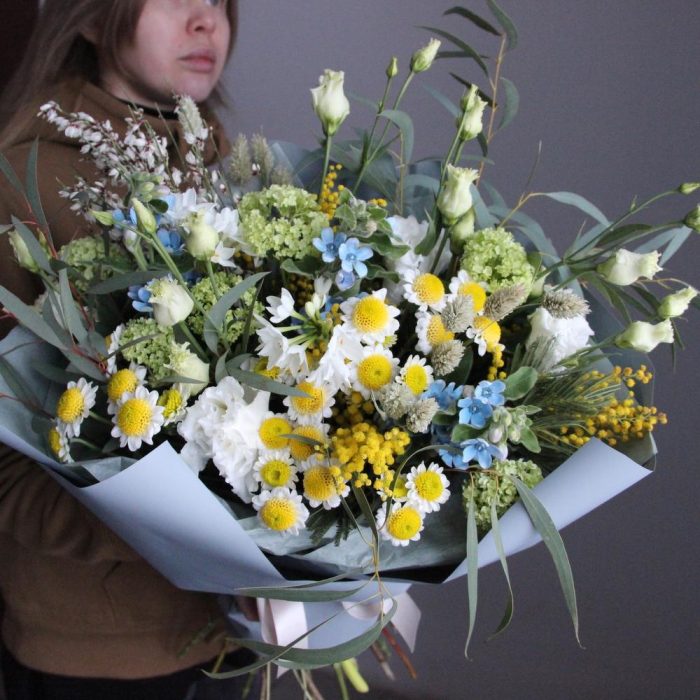 Душистый, весенний букет с мимозой, твидией, генистой, сантини, вибурнумом, канареечником и эвкалиптом.