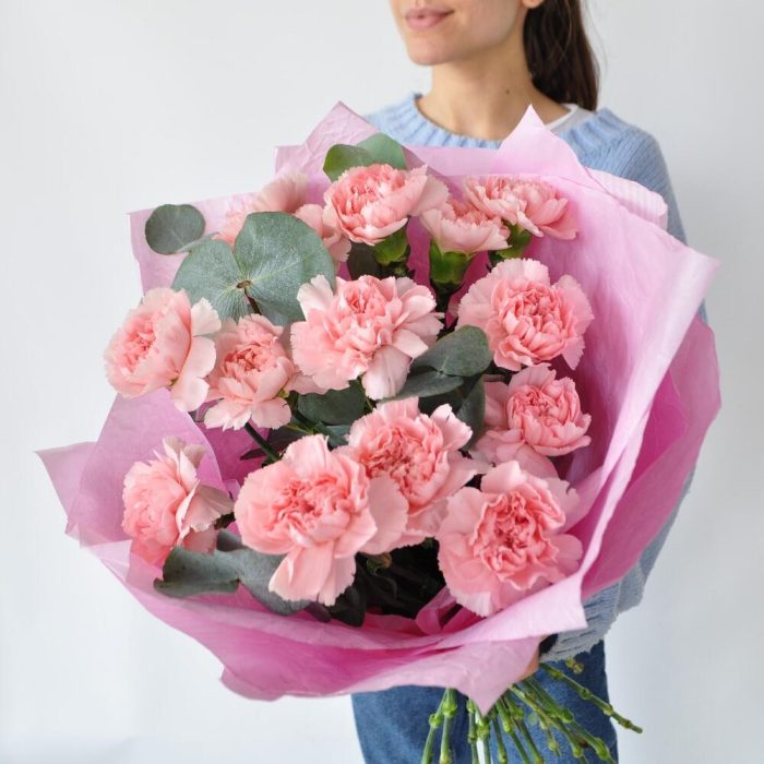 Гвоздика сортовая розовая – 15 шт.Эвкалипт – 3 шт.Упаковка дизайнерская – 1 шт.