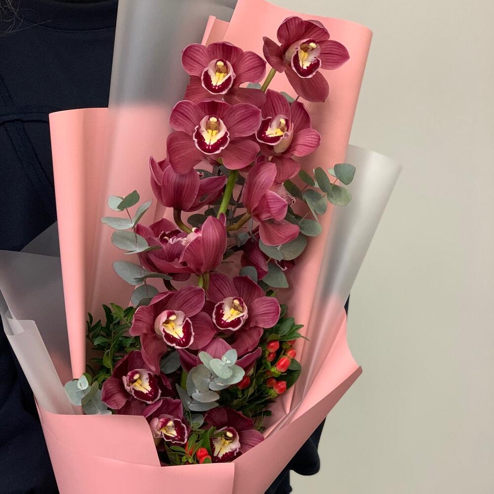 орхидея – 1 шт.Эвкалипт – 1 шт.Зелень – 2 шт.Гиперикум – 1 шт.Дизайнерская упаковка – 1 шт.