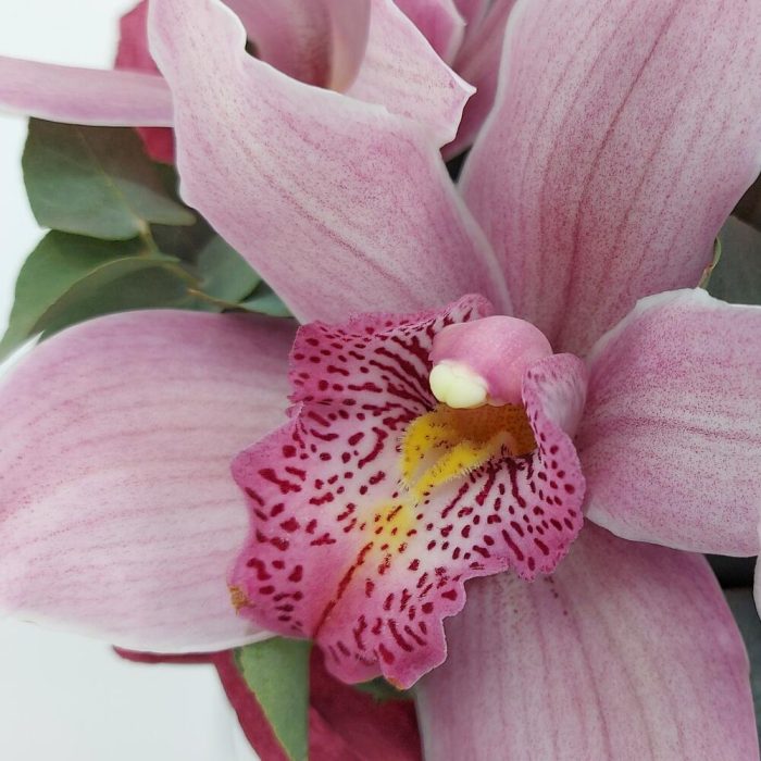 Темно-розовый Цимбидиум с эвкалитом в коробке