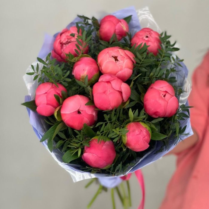 11 коралловых пионов с зеленью