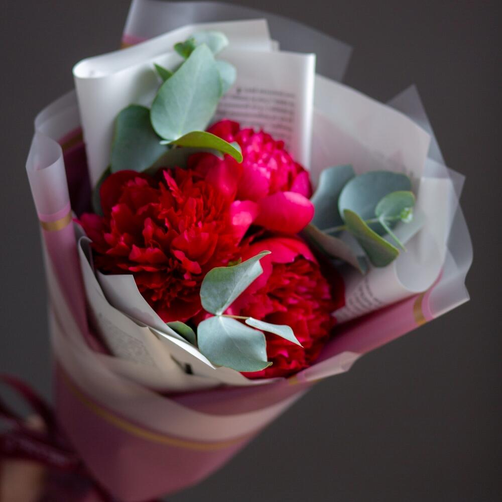 пион red sharm – 3 шт.эвкалипт cinerea – 2 шт.Корейская пленка – 2 шт.Атласная лента – 2 шт.