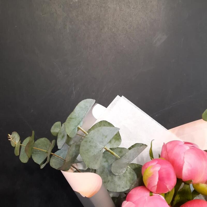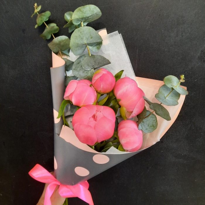 Пион Коралл Шарм (Coral Charm) – 5 шт.Эвкалипт – 1 шт.Упаковка дизайнерская – 1 шт.
