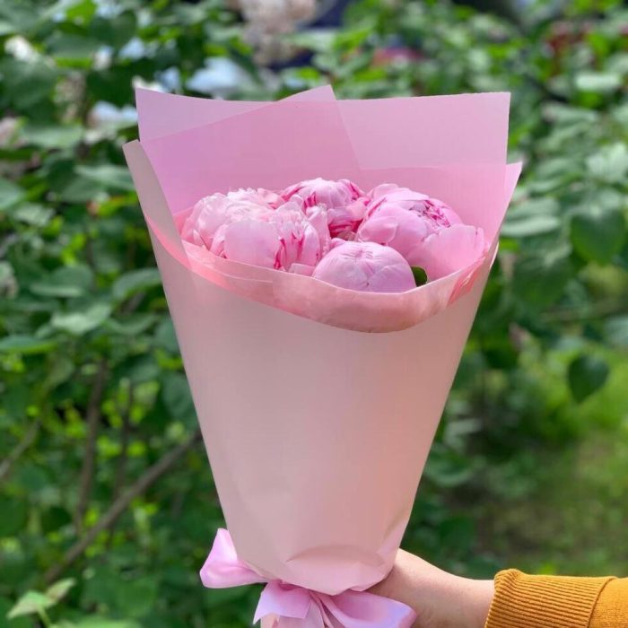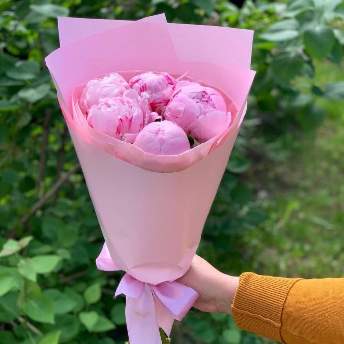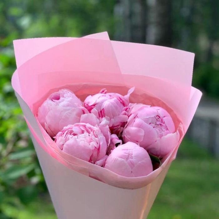Пион Сара Бернар – 5 шт.Упаковка дизайнерская – 1 шт.Лента атласная – 1 шт.