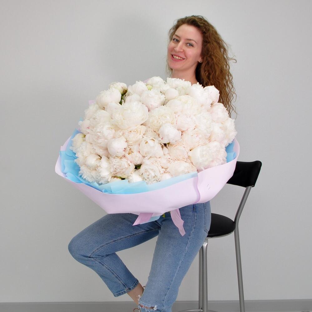 Лента атласная – 1 шт.Пион белый – 101 шт.Кризал (подкормка) – 1 шт.Пленка матовая – 5 шт.Аквапак – 1 шт.Фоамиран (упаковка) – 4 шт.инструкция по уходу за цветами – 1 шт.хорошее настроение в подарок – 1 шт.