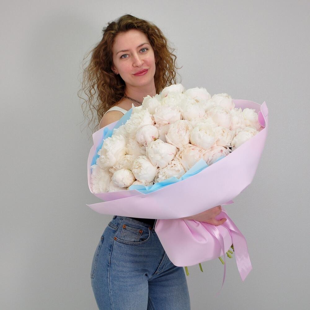 Лента атласная – 2 шт.Пион белый – 51 шт.Кризал (подкормка) – 1 шт.Пленка матовая – 3 шт.Аквапак – 1 шт.Фоамиран (упаковка) – 3 шт.инструкция по уходу за цветами – 1 шт.хорошее настроение в подарок – 1 шт.