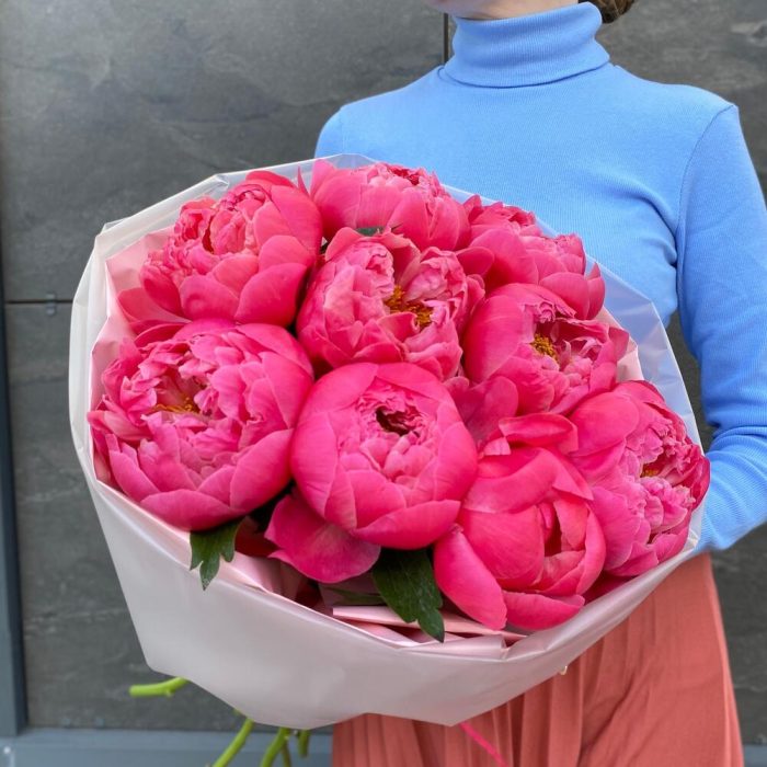 Букет 9 Пионов премиум коралл шарм