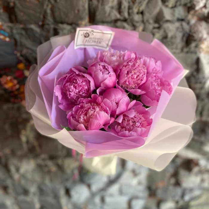 Букет из 9 ярко-розовых пионов в дизайнерской упаковке "Корал Шарм"