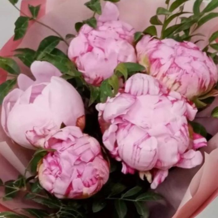 Эвкалипт – 3 шт.Лента атласная – 1 шт.Упаковка дизайнерская – 4 шт.пионы сара бернар – 5 шт.