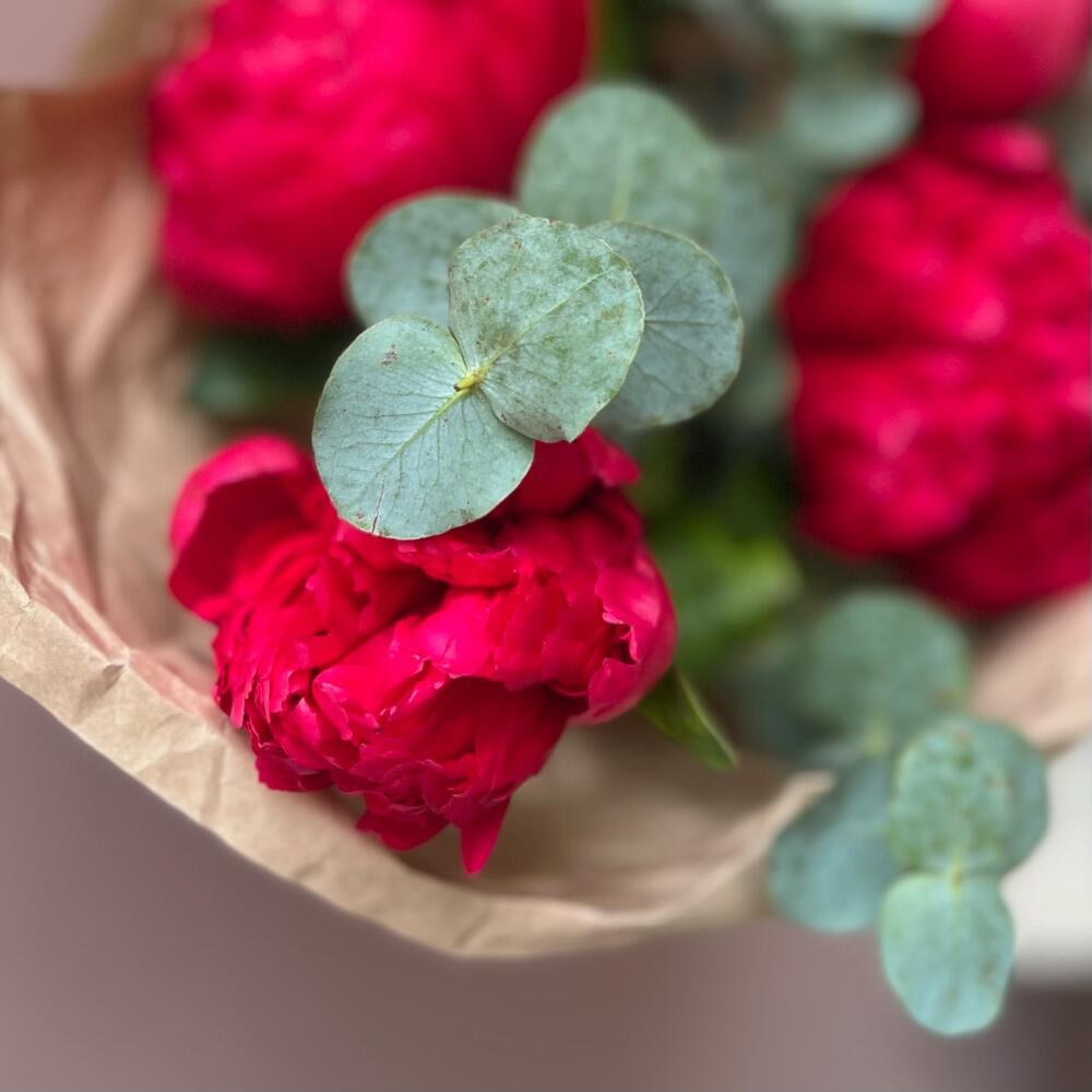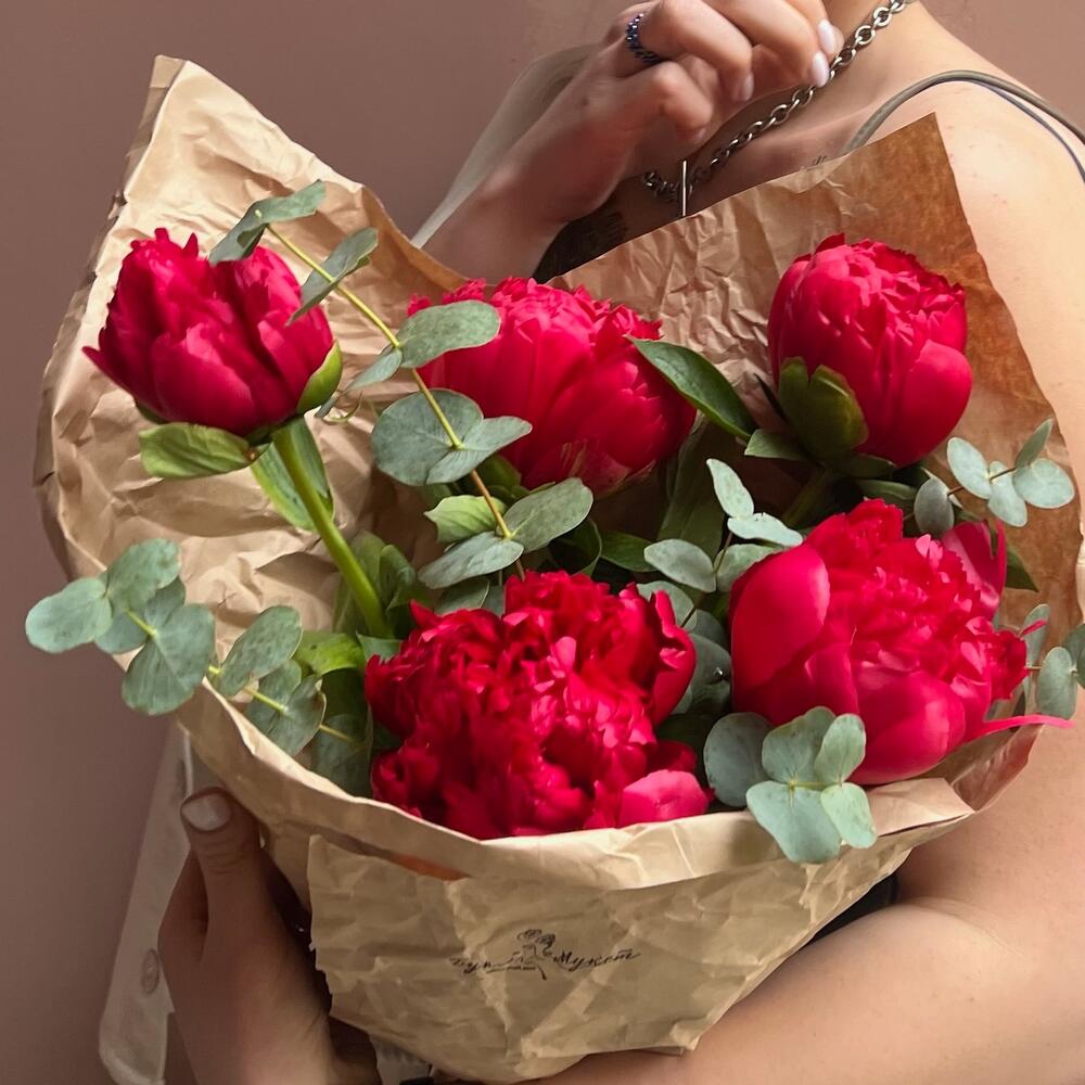Эвкалипт – 1 шт.Лента атласная – 1 шт.Крафт – 1 шт.пион белгравия – 5 шт.