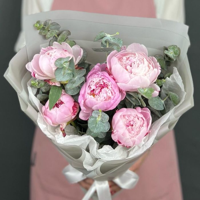 Эвкалипт – 5 шт.Лента атласная – 1 шт.Пион Сара Бернар – 5 шт.Бумага тишью – 1 шт.бумага дизайнерская – 5 шт.